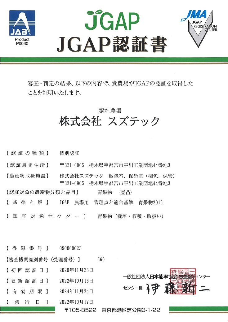 このたび株式会社スズテックは、令和4年10月24日に当社アグリ事業部で生産をしております豆苗において2度目の「JGAP」認証を受けました。